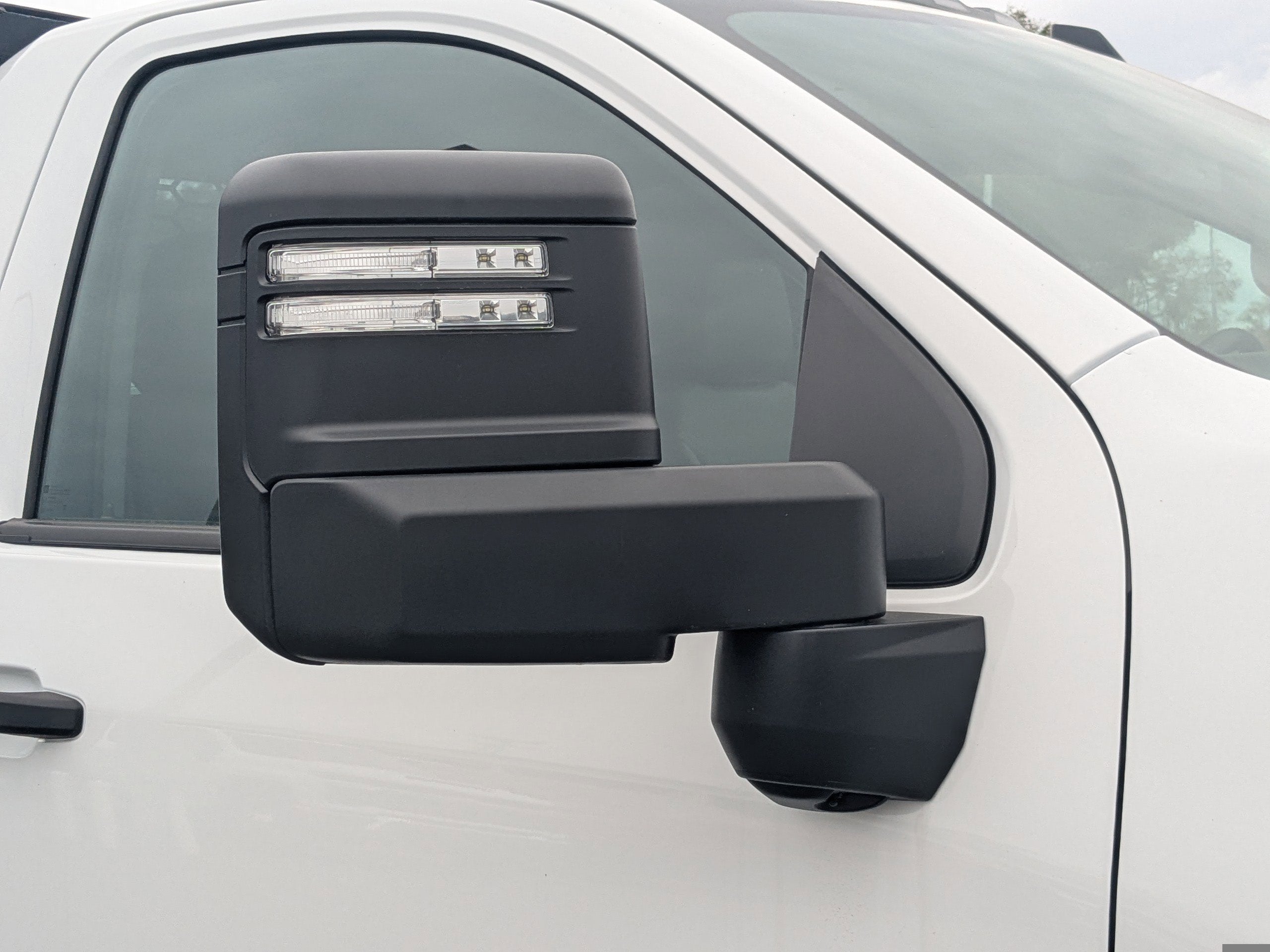 - Mirrors, outside power-adjustable vertical trailering with heated and auto-dimming upper glass lower convex mirrors, turn signal indicators, puddle lamps, (U12) perimeter lighting, auxiliary lighting, power folding/manual extending (extends 3.31" [84.25mm]), Black Includes (DD8) auto-dimming rearview mirror.)