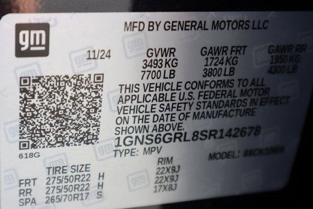 License Plate Front Mounting Package, Preferred Equipment Group 3LZ (15 Diagonal Multi-Color Head-Up Display, 3rd Row 60/40 Power-Folding Split-Bench, 4-Way Power Driver Lumbar Seat Adjuster, 4-Way Power Front Passenger Lumbar Seat Adjuster, 8-Way Power Front Passenger Seat Adjuster, Dual Exhaust System, Front LED Fog Lamps, Heated 2nd Row Outboard Seats, Heated Power-Adjustable Outside Mirrors, Heated Steering Wheel, LED Tail Lamps, Magnetic Ride Control Suspension, Memory Settings, Power Release 2nd Row Bucket Seats, Power-Sliding Center Floor Console, Rear Power Liftgate, Universal Home Remote, and Wireless Phone Charging), 10 Speakers, 3.23 Rear Axle Ratio, 3rd row seats: split-bench, 4-Wheel Disc Brakes, 8-Way Power Driver Seat Adjuster, ABS brakes, Adaptive suspension, Air Conditioning, Alloy wheels, AM/FM radio: SiriusXM with 360L, Apple CarPlay/Android Auto, Auto High-beam Headlights, Auto-dimming door mirrors, Auto-dimming Rear-View mirror, Auto-leveling suspension, Automatic temperature control, Brake assist, Bumpers: body-color, Compass, Delay-off headlights, Driver door bin, Driver vanity mirror, Dual front impact airbags, Dual front side impact airbags, Electronic Stability Control, Emergency communication system: OnStar Services capable, Exterior Parking Camera Rear, Four wheel independent suspension, Front anti-roll bar, Front Bucket Seats, Front Center Armrest, Front dual zone A/C, Front fog lights, Front reading lights, Fully automatic headlights, Garage door transmitter, Heads-Up Display, Heated door mirrors, Heated front seats, Heated rear seats, Heated steering wheel, Illuminated entry, Low tire pressure warning, Memory seat, Navigation system: Google built-in compatibility (select service plan required, terms and limitations apply), Occupant sensing airbag, Outside temperature display, Overhead airbag, Overhead console, Panic alarm, Passenger door bin, Passenger vanity mirror, Perforated Leather Seating Surfaces, Power door mirrors, Power driver seat, Power Liftgate, Power passenger seat, Power steering, Power windows, Radio data system, Radio: 17.7 Diagonal Advanced Color LCD Display, Rain sensing wipers, Rear air conditioning, Rear anti-roll bar, Rear reading lights, Rear window defroster, Rear window wiper, Remote keyless entry, Security system, Speed control, Speed-sensing steering, Split folding rear seat, Spoiler, Steering wheel memory, Steering wheel mounted audio controls, Tachometer, Telescoping steering wheel, Tilt steering wheel, Traction control, Trip computer, Turn signal indicator mirrors, Variably intermittent wipers, Ventilated front seats, Voltmeter, and Wireless Apple CarPlay/Wireless Android Auto.